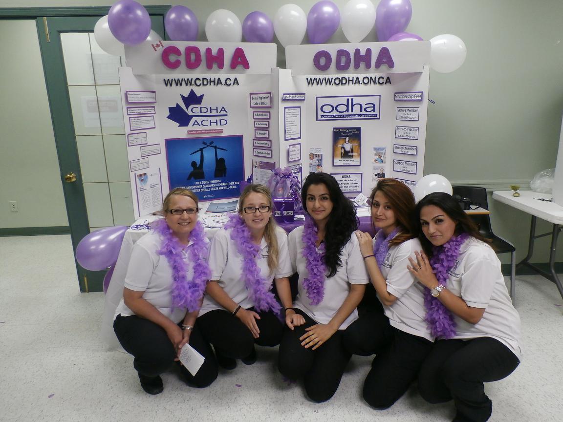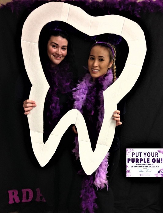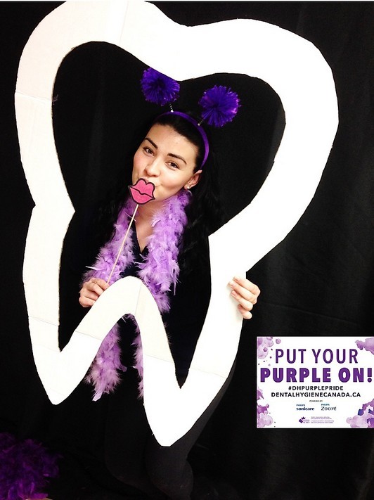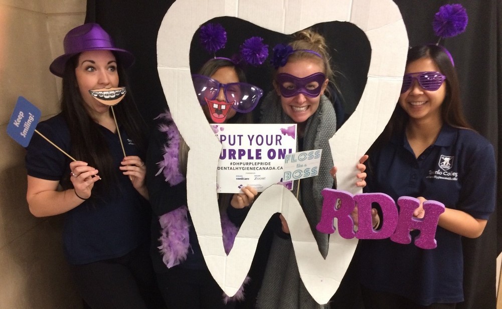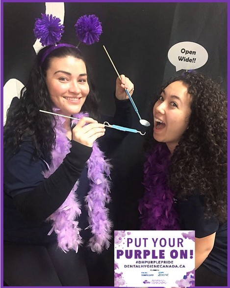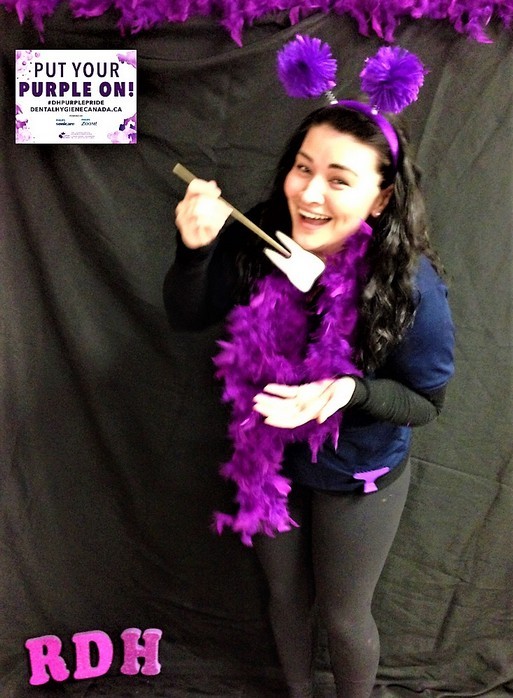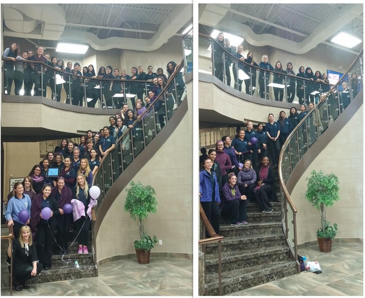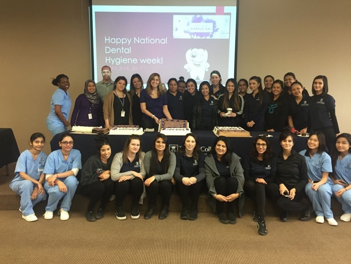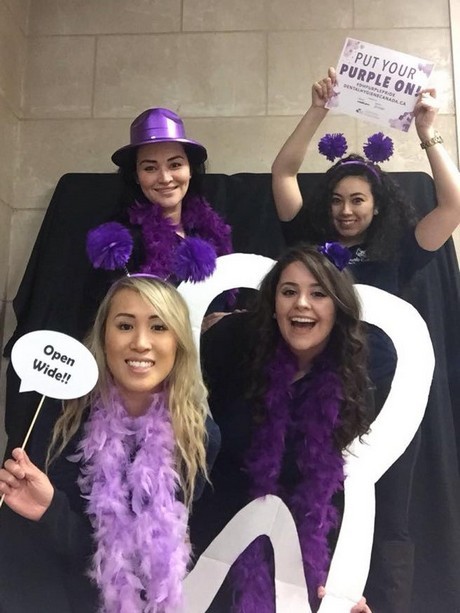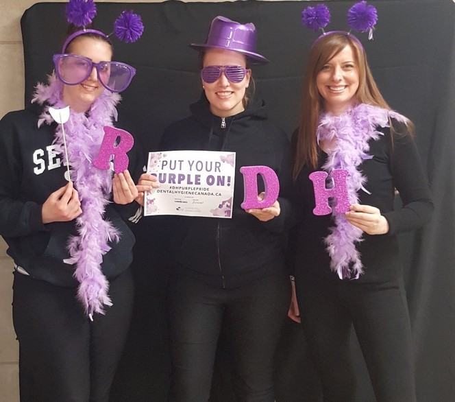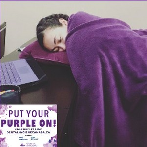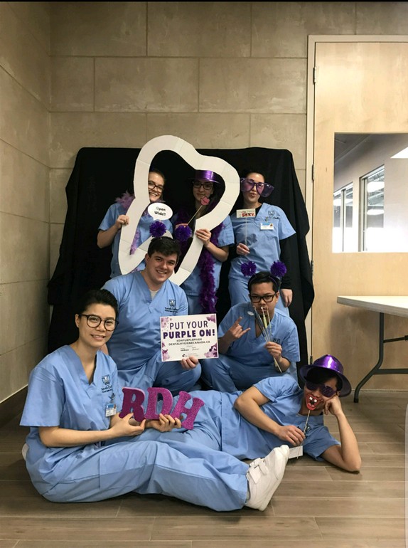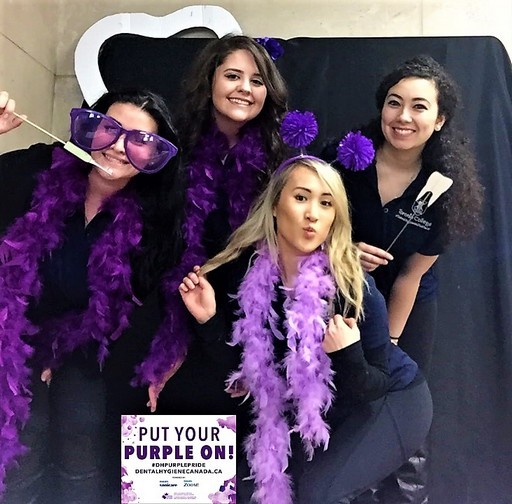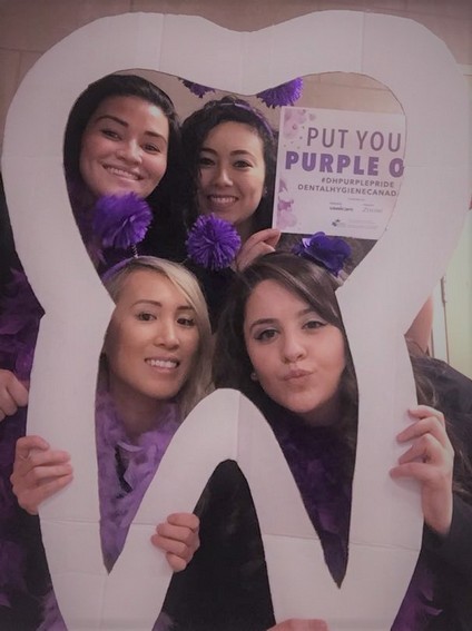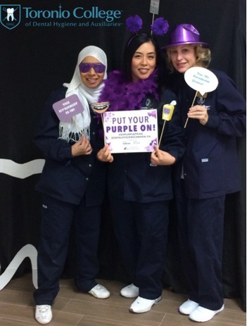 Students excitedly gather to eat pizza in celebration of their win in the 'Put Your Purple On! Photo Contest' sponsored by the Canadian Dental Hygienists Association