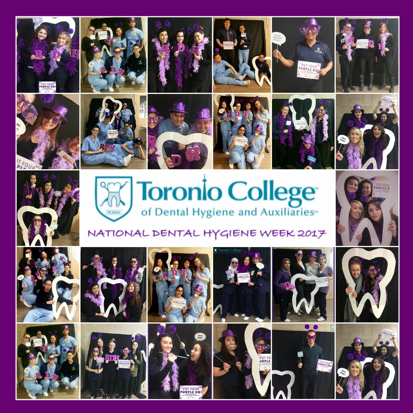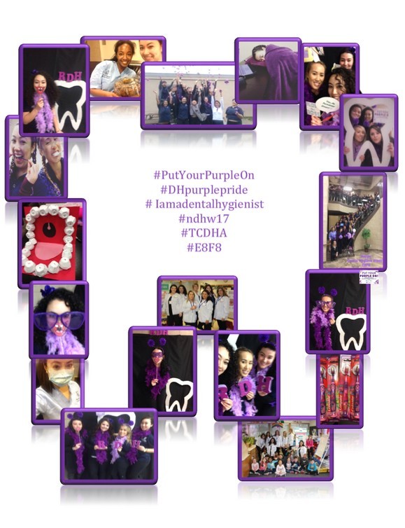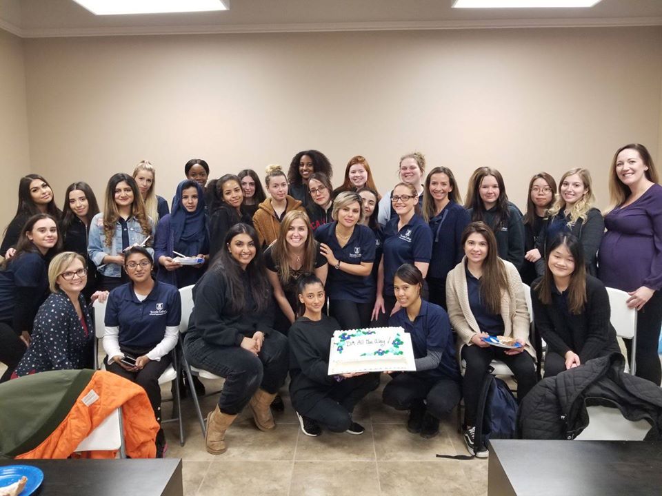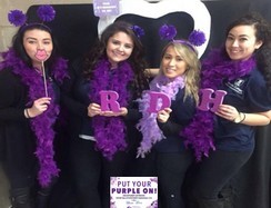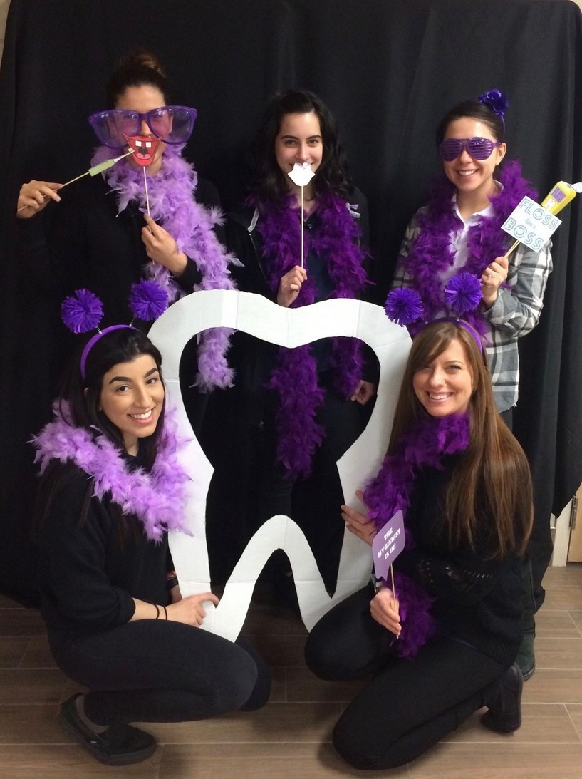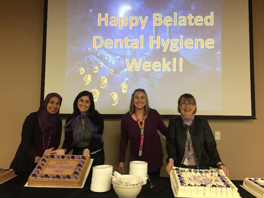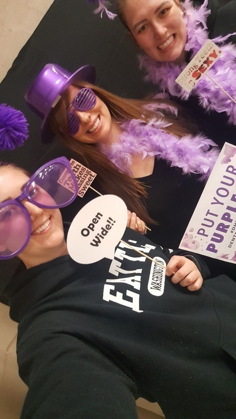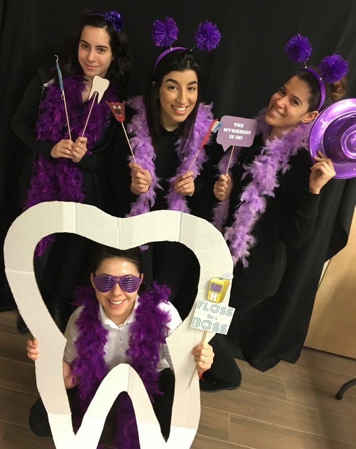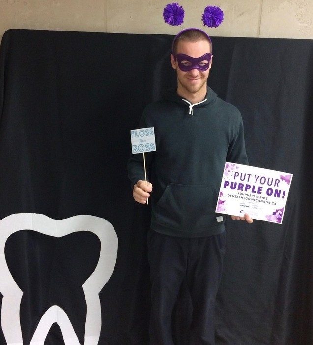 Students excitedly gather to eat pizza in celebration of their win in the 'Put Your Purple On! Photo Contest' sponsored by the Canadian Dental Hygienists Association
