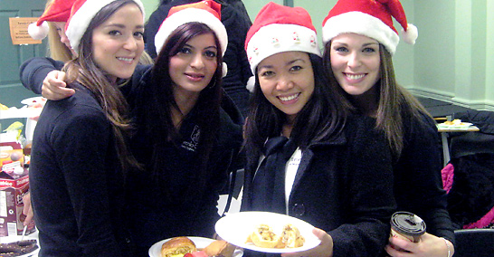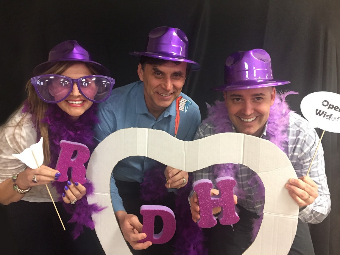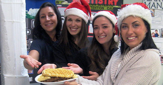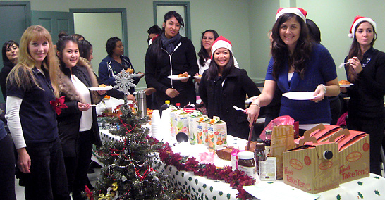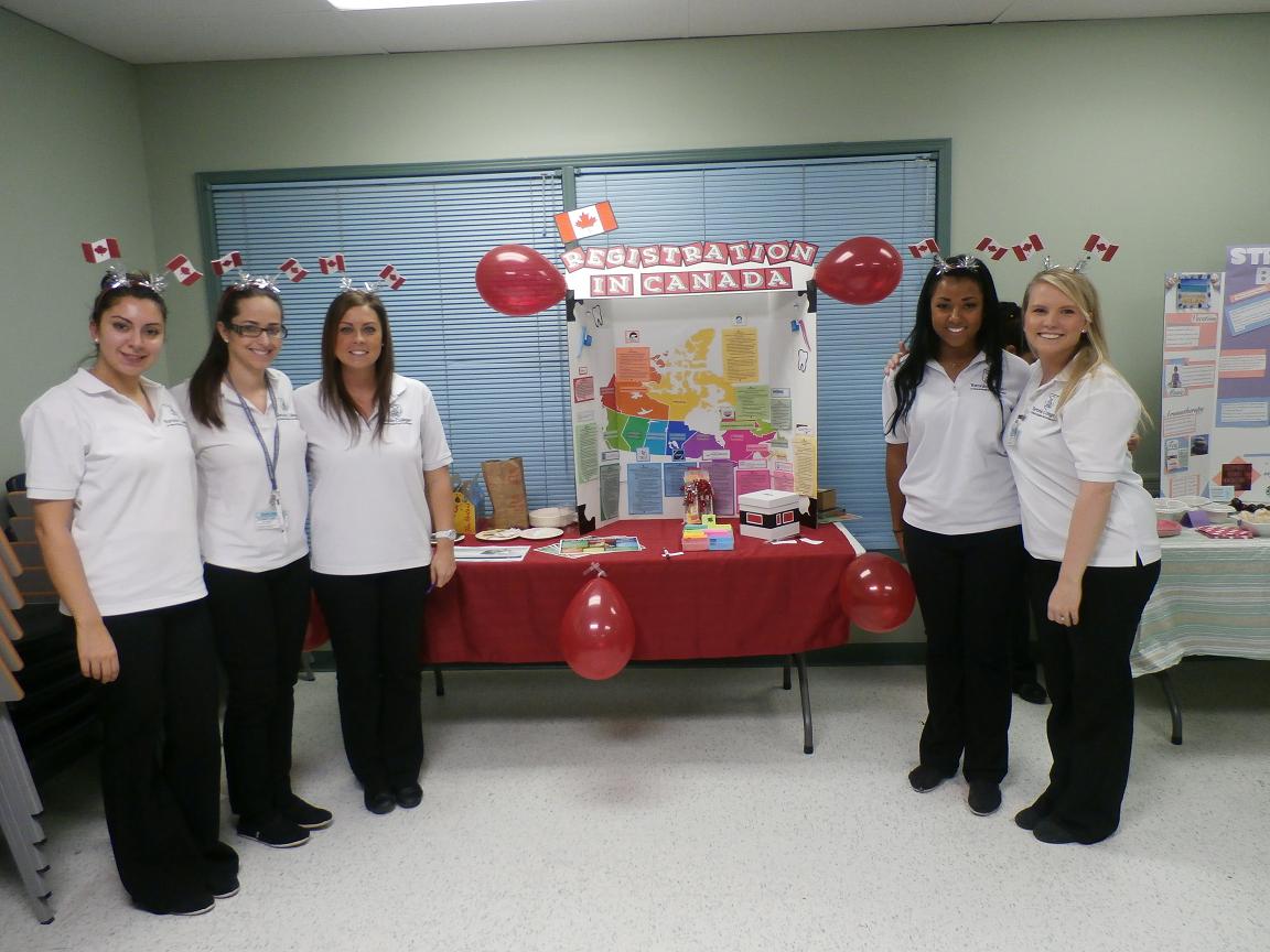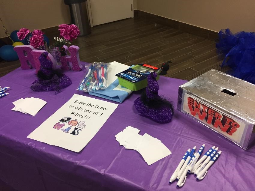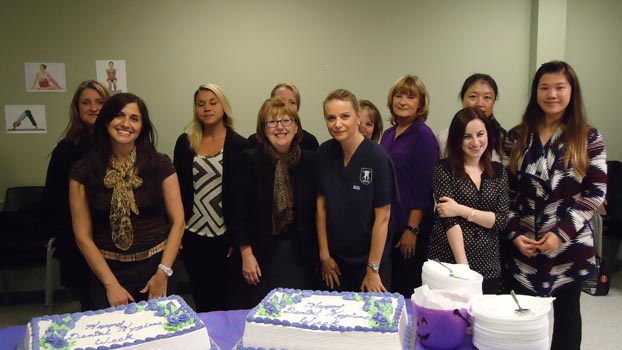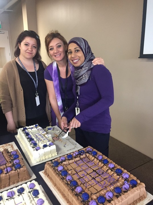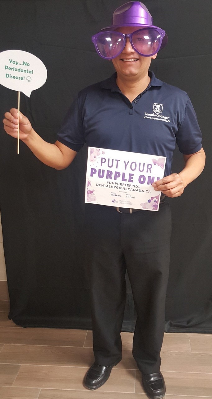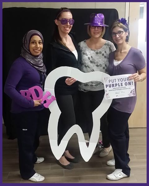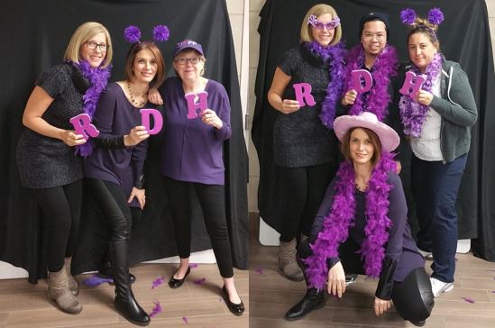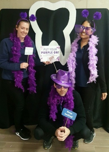Students excitedly gather to eat pizza in celebration of their win in the 'Put Your Purple On! Photo Contest' sponsored by the Canadian Dental Hygienists Association